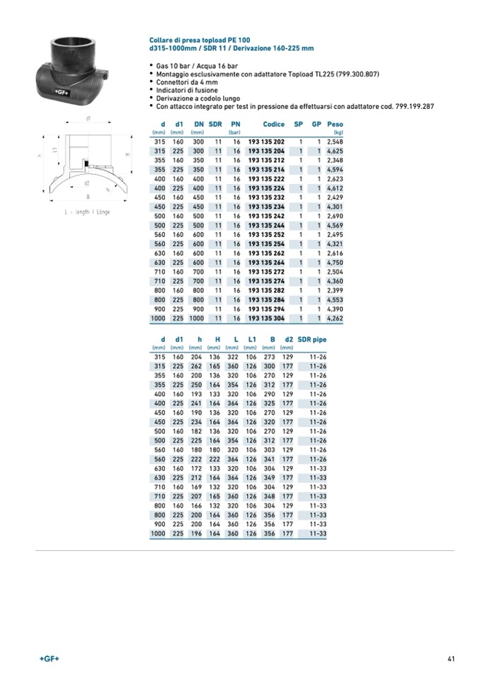 d315-1000mm / SDR 11 / Derivazione 160-225 mm