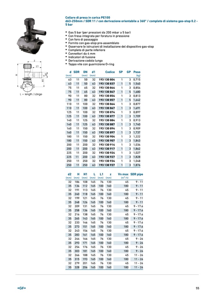 d63-250mm / SDR 11 / con derivazione orientabile a 360° / completo di sistema gas-stop 0.2 -