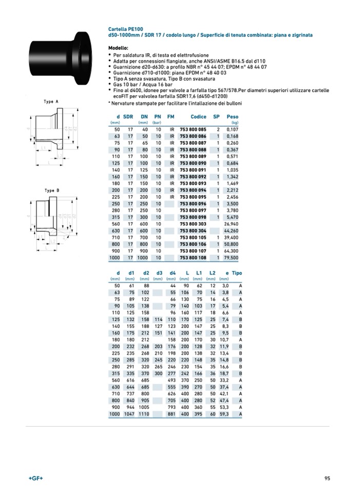 d50-1000mm / SDR 17 / codolo lungo / Superficie di tenuta combinata: piana e zigrinata