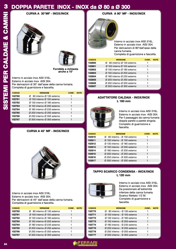 Per derivazioni di 30° dall’asse della canna fumaria.