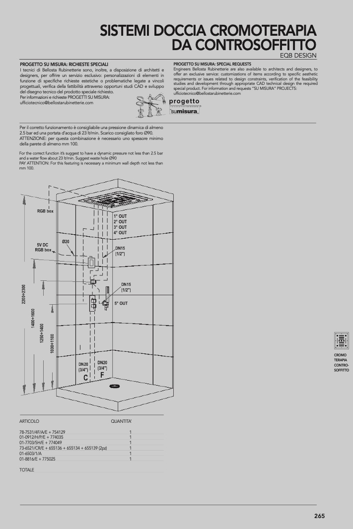 2.5 bar ed una portata d’acqua di 23 lt/min. Scarico consigliato foro Ø90.