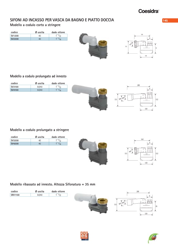 Modello ribassato ad innesto. Altezza Sifonatura = 35 mm