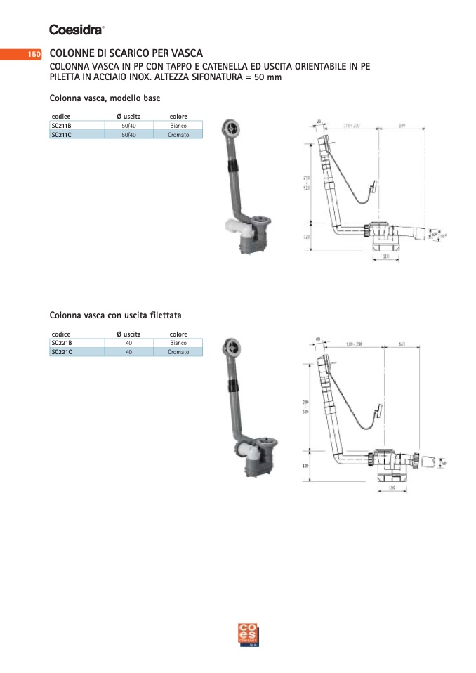COLONNA VASCA IN PP CON TAPPO E CATENELLA ED USCITA ORIENTABILE IN PE