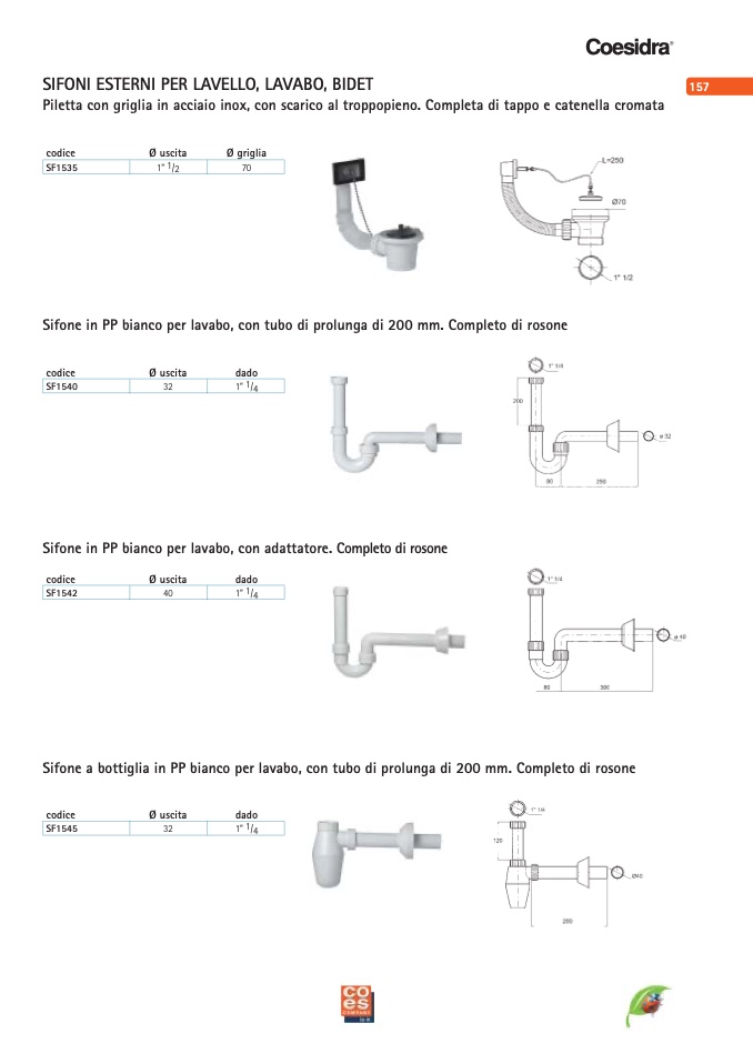 Sifone in PP bianco per lavabo, con tubo di prolunga di 200 mm. Completo di rosone