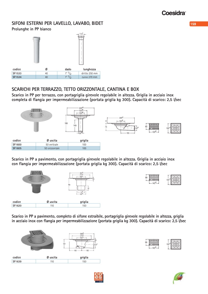 con flangia per impermeabilizzazione (portata griglia kg 300). Capacità di scarico: 2,5 l/sec