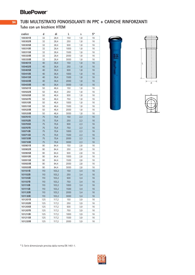 * S: Serie dimensionale prevista dalla norma EN 1451-1.