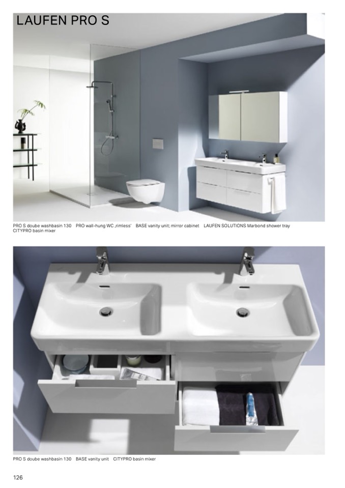 RO S doube washbasin 130 RO wall-hung WC rimless‘ BASE vanity unit mirror cabinet LAUFEN SOLUIONS Marbond shower tray