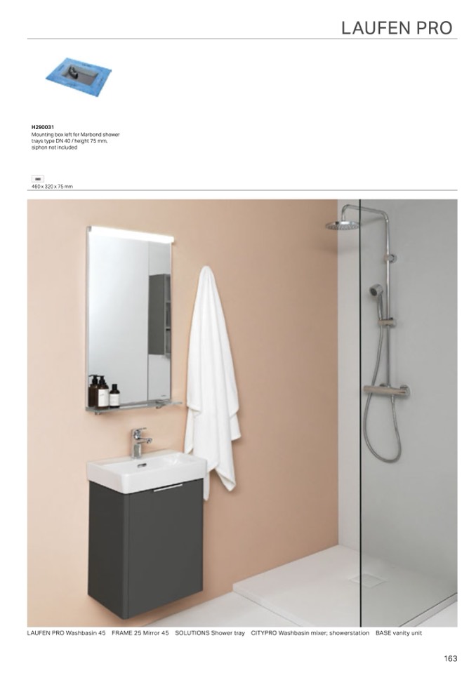LAUFEN RO Washbasin 45 FRAME 25 Mirror 45 SOLUIONS Shower tray CIRO Washbasin mixer showerstation BASE vanity unit