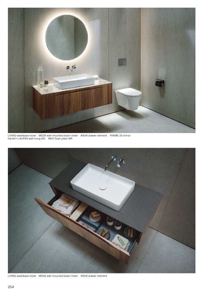 LIIN washbasin bowl MEDA wall-mounted basin mixer ARUN drawer element FRAME 25 mirror