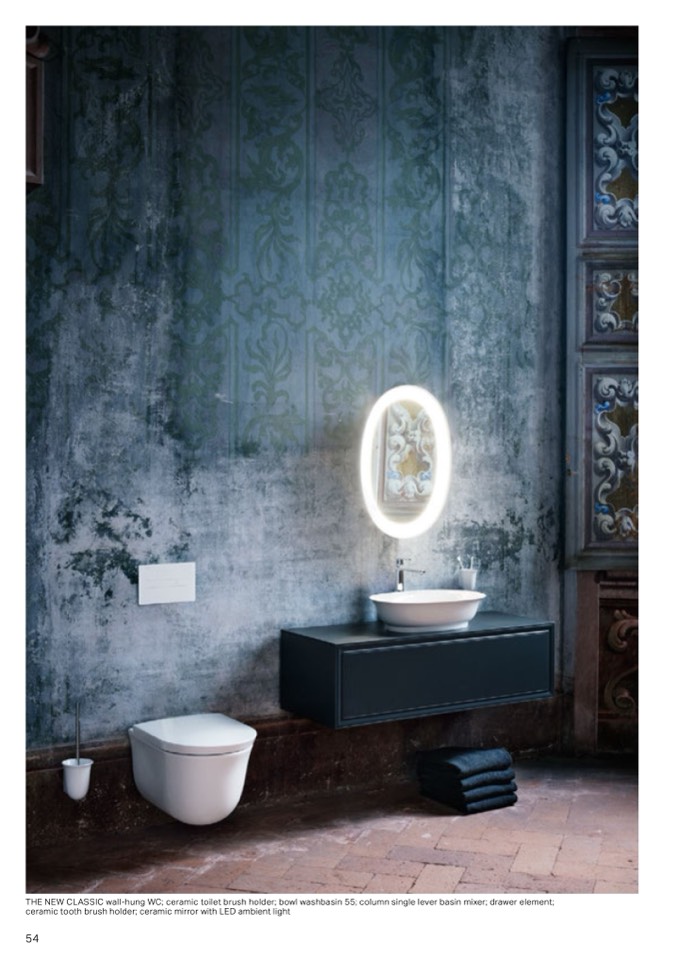 THE NEW CLASSIC wall-hung WC; ceramic toilet brush holder; bowl washbasin 55; column single lever basin mixer; drawer element;