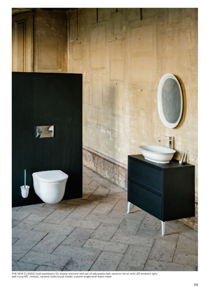 THE NEW CLASSIC bowl washbasin 55; drawer element with set of adjustable feet; ceramic mirror with LED ambient light;
