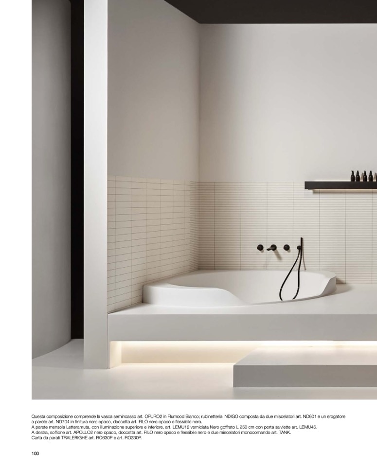 Questa composizione comprende la vasca semincasso art. OFURO2 in Flumood Bianco; rubinetteria INDIGO composta da due miscelatori art. ND601 e un erogatore