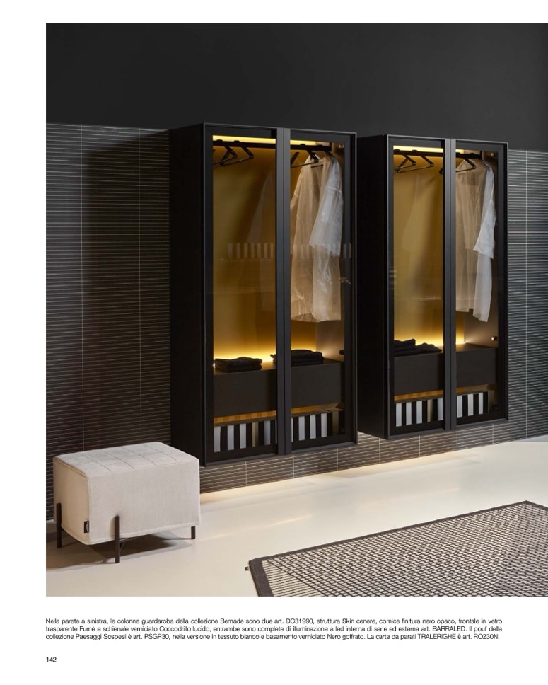 Nella parete a sinistra, le colonne guardaroba della collezione Bemade sono due art. DC31990, struttura Skin cenere, cornice