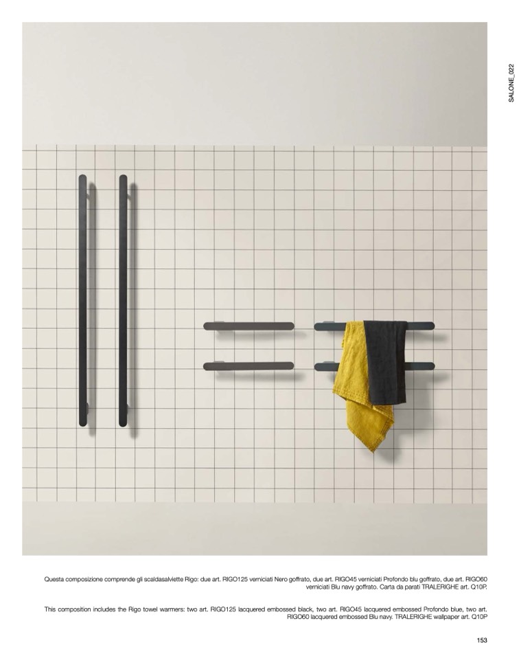 This composition includes the Rigo towel warmers: two art. RIGO125 lacquered embossed black, two art. RIGO45 lacquered embossed Profondo blue, two art.