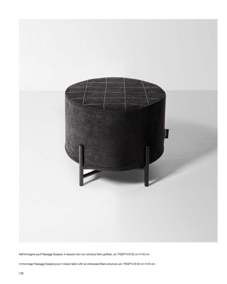 Nell’immagine pouf Paesaggi Sospesi, in tessuto nero con struttura Nero goffrato, art. PSGP10 Ø 50 cm H 40 cm.