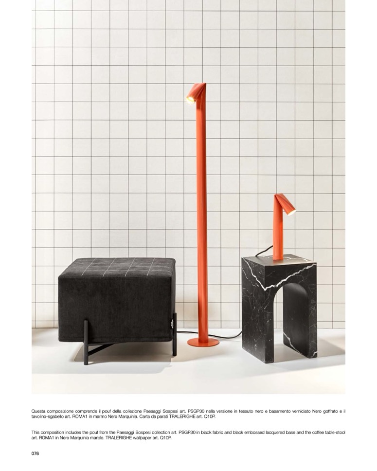 Questa composizione comprende il pouf della collezione Paesaggi Sospesi art. PSGP30 nella versione in tessuto nero e basamento verniciato Nero goffrato e il
