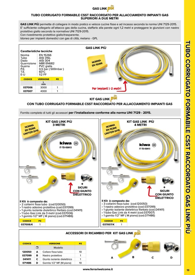 Ù permette di collegare in modo pratico e veloce cucine fisse e ad incasso secondo la norma UNI 7129-2015.