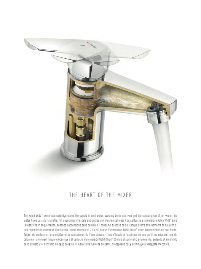 water flows outside its profile, not depositing limescale and decreasing mechanical wear / La cartuccia a immersione Nobili Widd