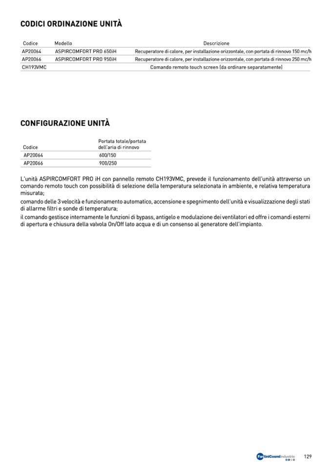 L'unità ASPIRCOMFORT PRO iH con pannello remoto CH193VMC, prevede il funzionamento dell'unità attraverso un