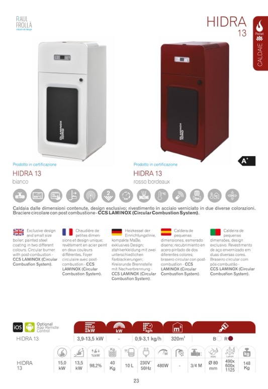Caldaia dalle dimensioni contenute, design esclusivo; rivestimento in acciaio verniciato in due diverse colorazioni.
