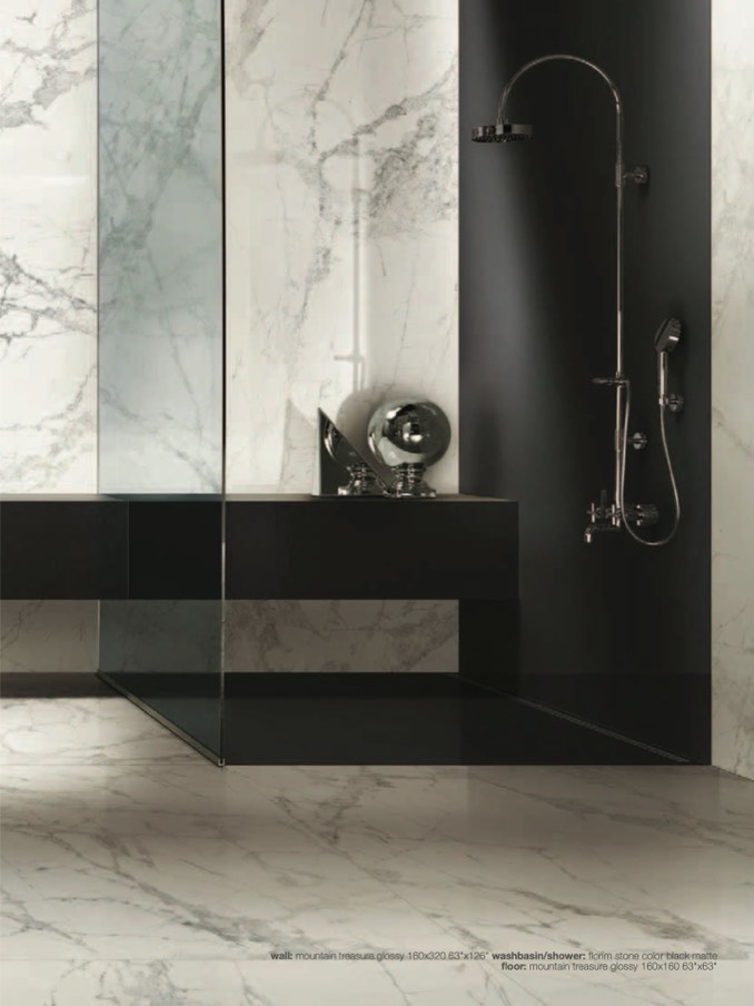 wall: mountain treasure glossy 160x320 63"x126" washbasin/shower: florim stone color black matte