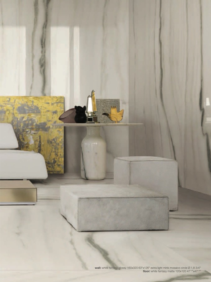 wall: white fantasy glossy 160x320 63"x126" extra light mink mosaico circle Ø 1,8 3/4"