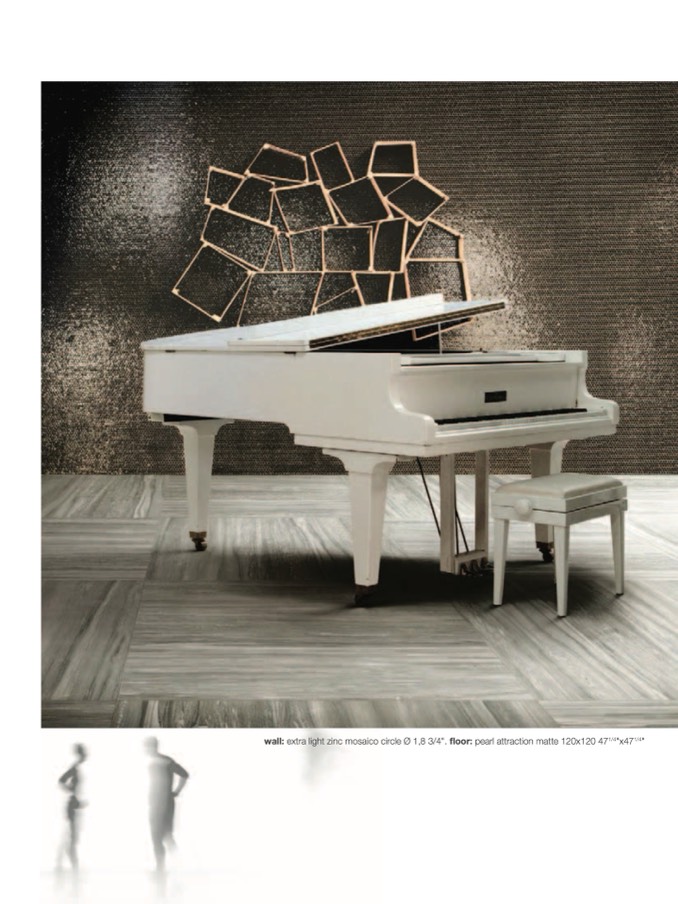wall: extra light zinc mosaico circle Ø 1,8 3/4". floor: pearl attraction matte 120x120 47