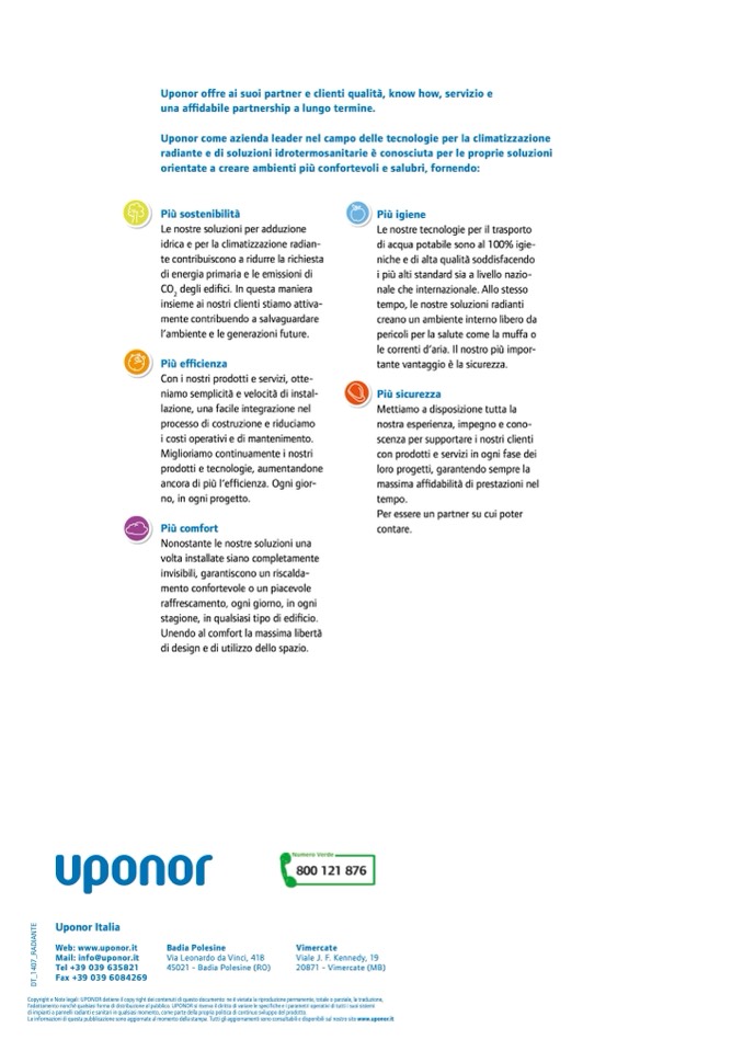 Copyright e Note legali: UPONOR detiene il copy right dei contenuti di questo documento: ne è vietata la riproduzione permanente, totale o parziale, la traduzione,
