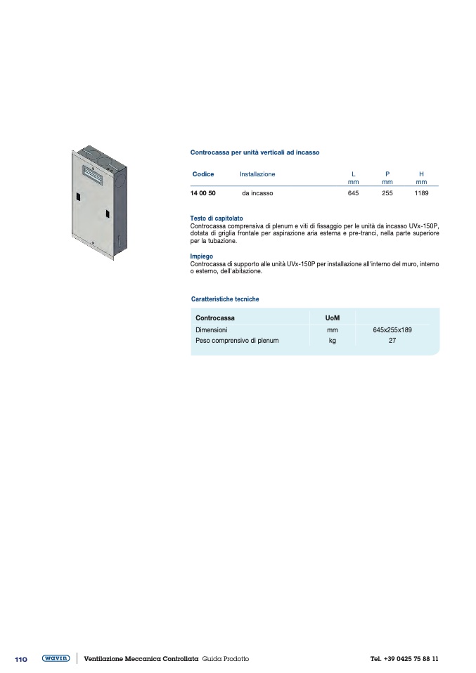 Controcassa di supporto alle unità UVx-150P per installazione all'interno del muro, interno