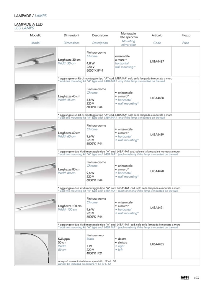 * aggiungere un kit di montaggio tipo “A” cod. L4BA14A1 solo se la lampada è montata a muro