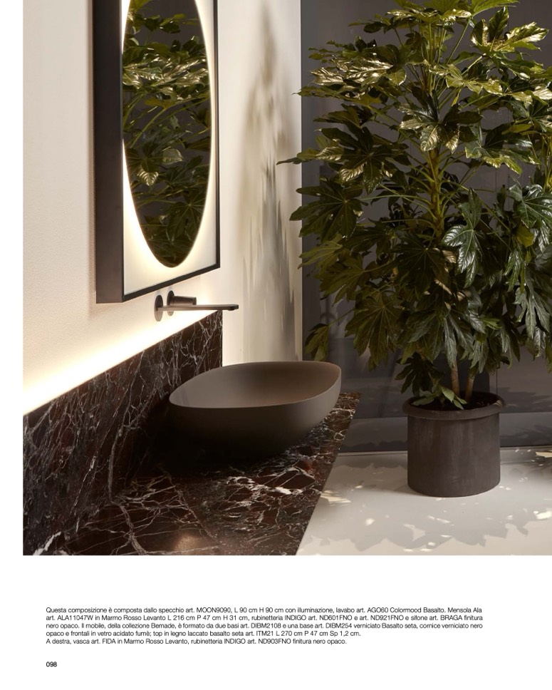 Questa composizione è composta dallo specchio art. MOON9090, L 90 cm H 90 cm con illuminazione, lavabo art. AGO60 Colormood Basalto. Mensola Ala