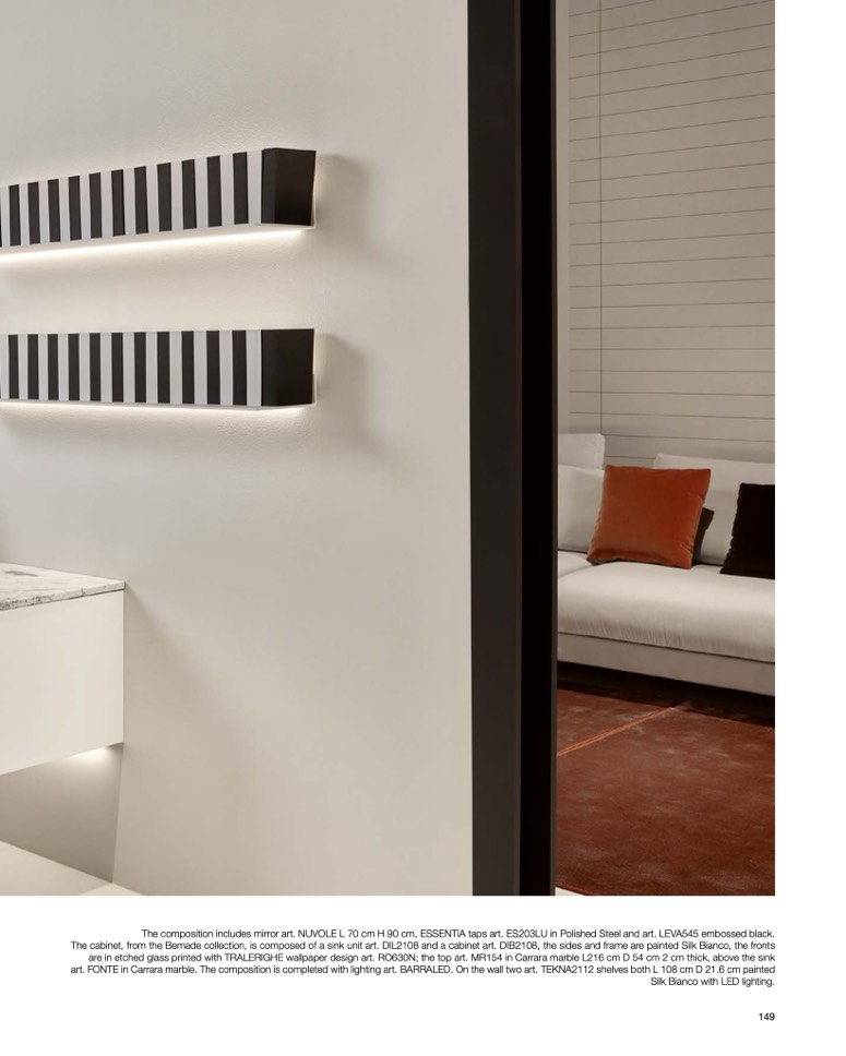art. FONTE in Carrara marble. The composition is completed with lighting art. BARRALED. On the wall two art. TEKNA2112 shelves both L 108 cm D 21.6 cm painted