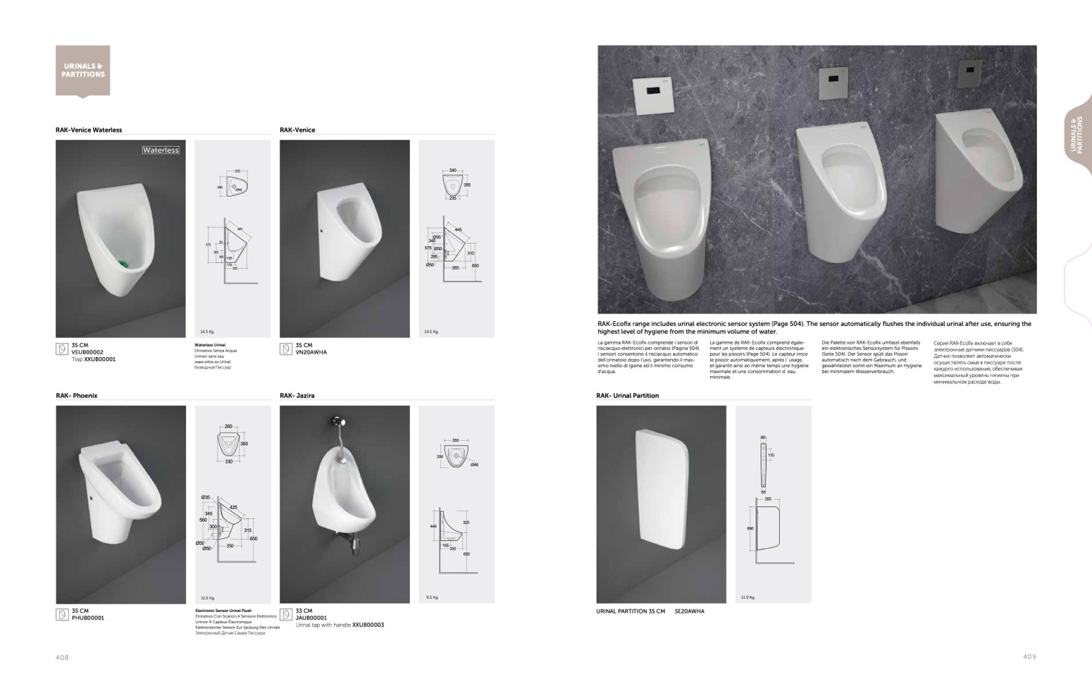 RAK-Ecofix range includes urinal electronic sensor system (Page 504). The sensor automatically flushes the individual urinal after use, ensuring the