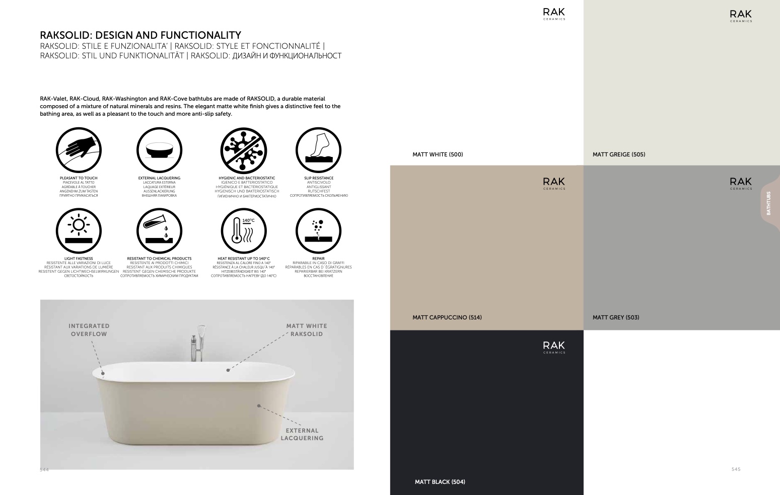 RAK-Valet, RAK-Cloud, RAK-Washington and RAK-Cove bathtubs are made of RAKSOLID, a durable material