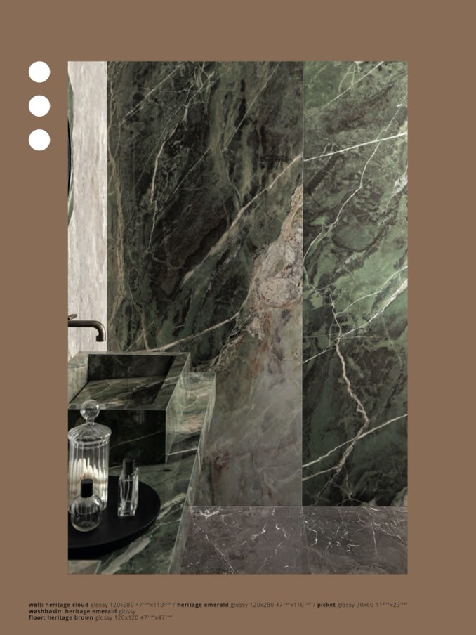 wall: heritage cloud glossy 120x280 471/4”x1101/4” / heritage emerald glossy 120x280 471/4”x1101/4” / picket glossy 30x60 114/5”x235/8”