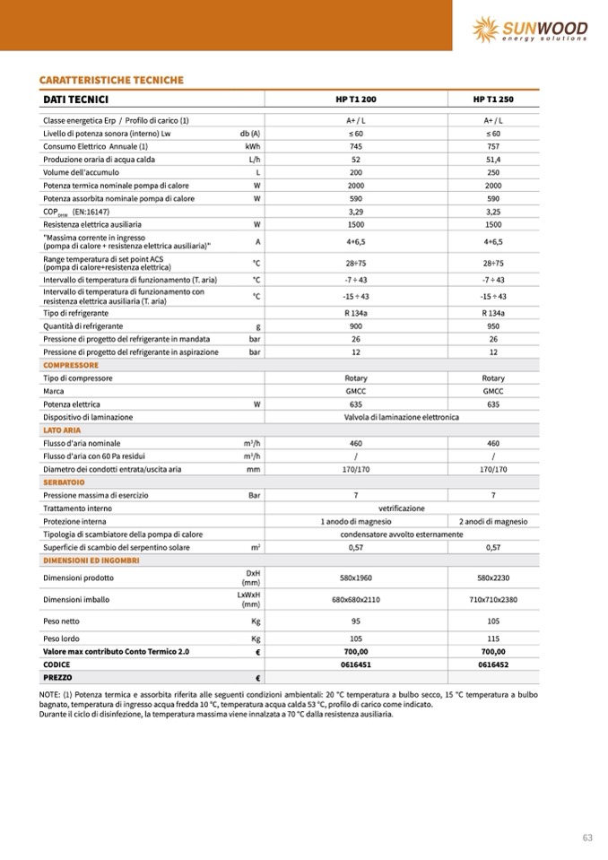 NOTE: (1) Potenza termica e assorbita riferita alle seguenti condizioni ambientali: 20 °C temperatura a bulbo secco, 15 °C temperatura a bulbo