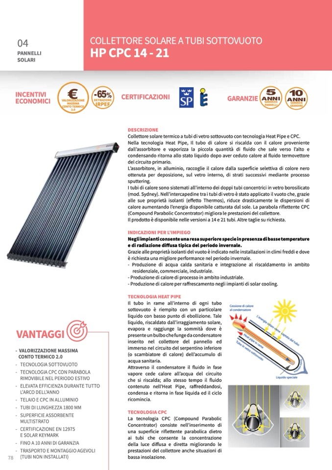 Collettore solare termico a tubi di vetro sottovuoto con tecnologia Heat Pipe e CPC.