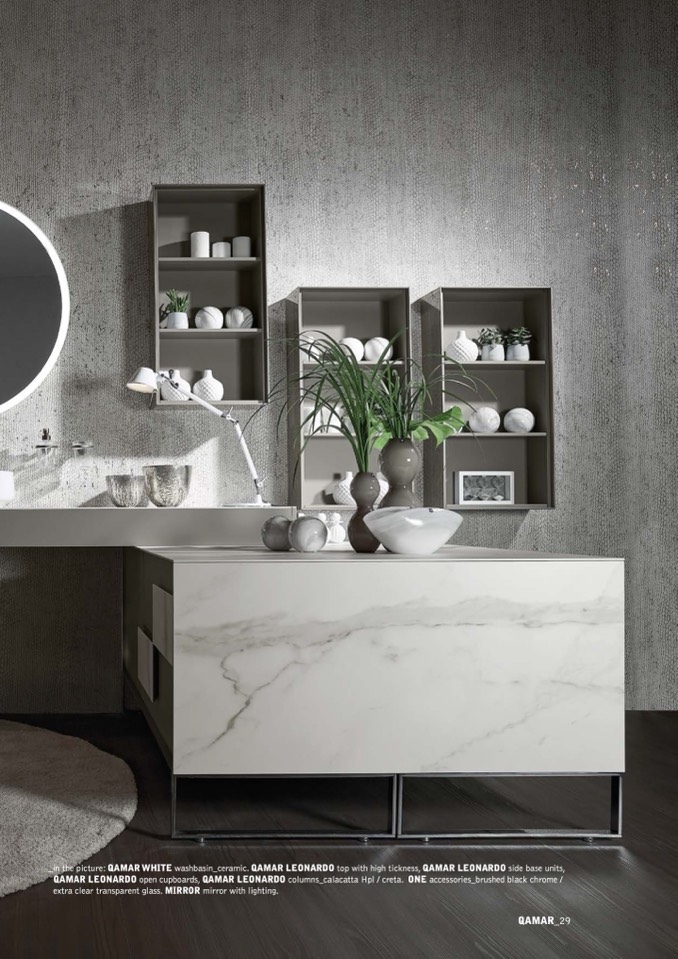 _in the picture: QAMAR WHITE washbasin_ceramic. QAMAR LEONARDO top with high tickness, QAMAR LEONARDO side base units,