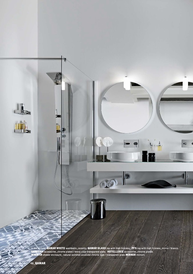 _in the picture: QAMAR WHITE washbasin_ceramic. QAMAR GLASS top with high tickness, PFS top with high tickness_mirror / bianco.