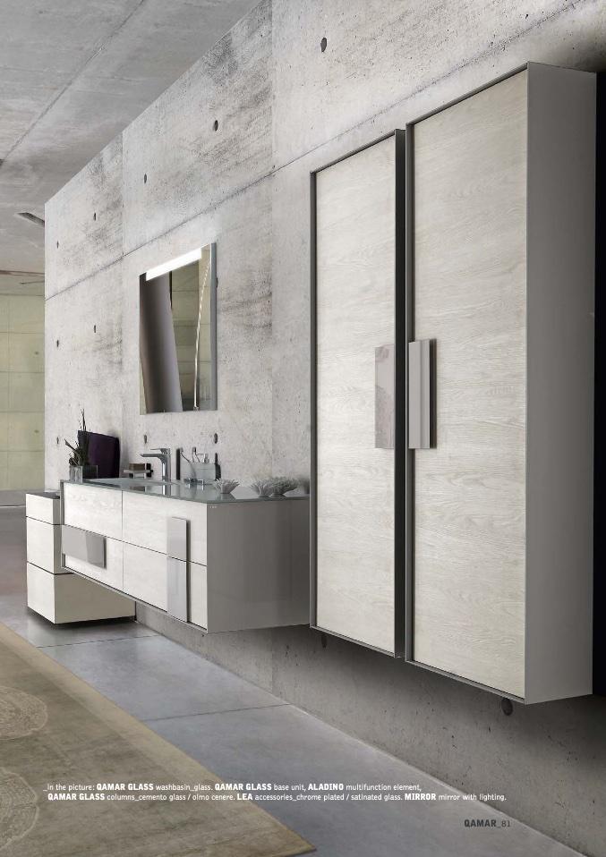 QAMAR GLASS columns_cemento glass / olmo cenere. LEA accessories_chrome plated / satinated glass. MIRROR mirror with lighting.