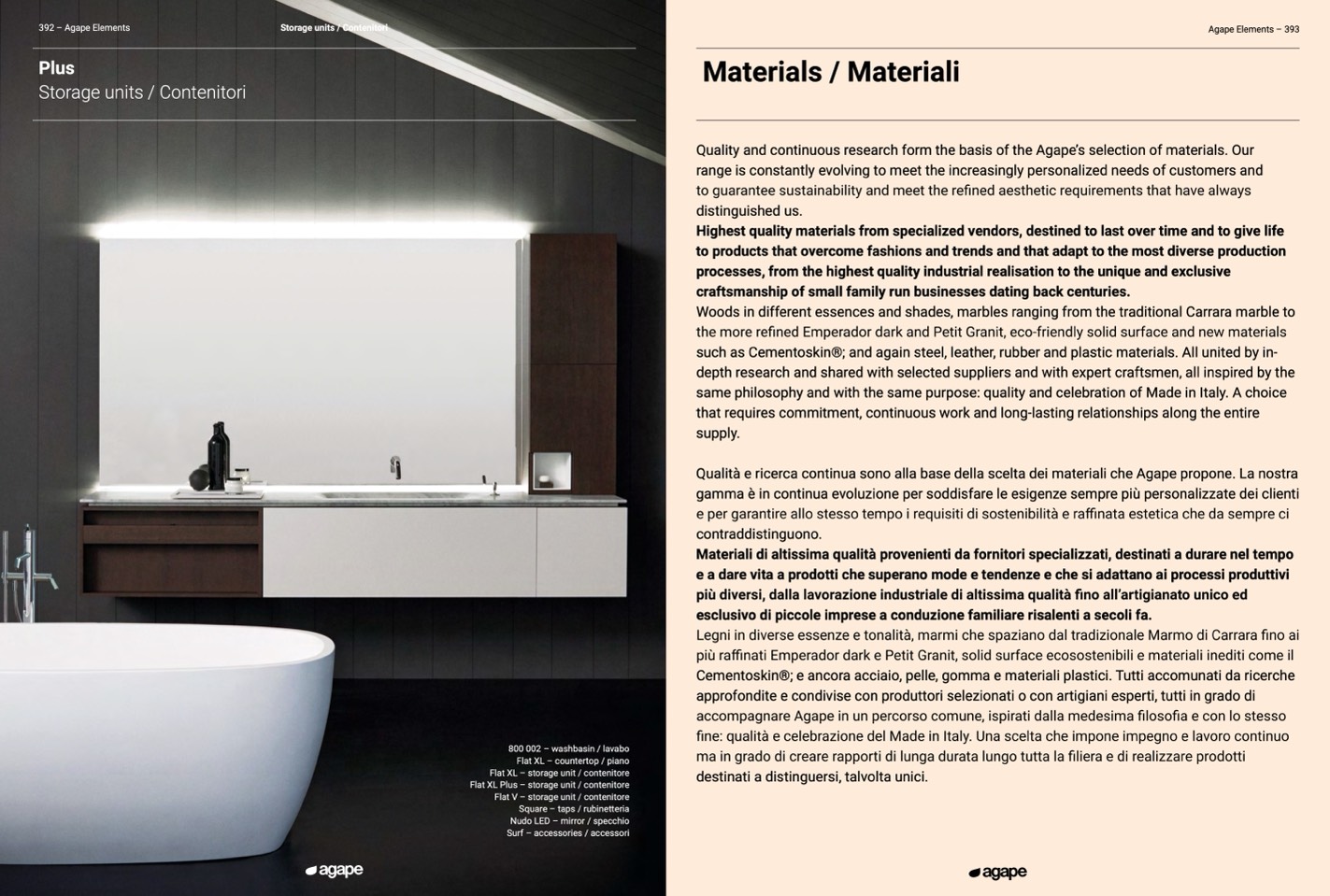 Quality and continuous research form the basis of the Agape’s selection of materials. Our