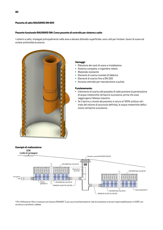 * Per infiltrazione: filtro in tessuto non tessuto RAUMAT 3; per accumulo/laminazione: telo di protezione e tenuta impermeabilizzante in HDPE con