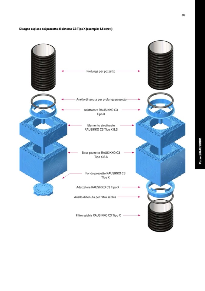 Disegno esploso del pozzetto di sistema C3 Tipo X (esempio: 1,5 strati)