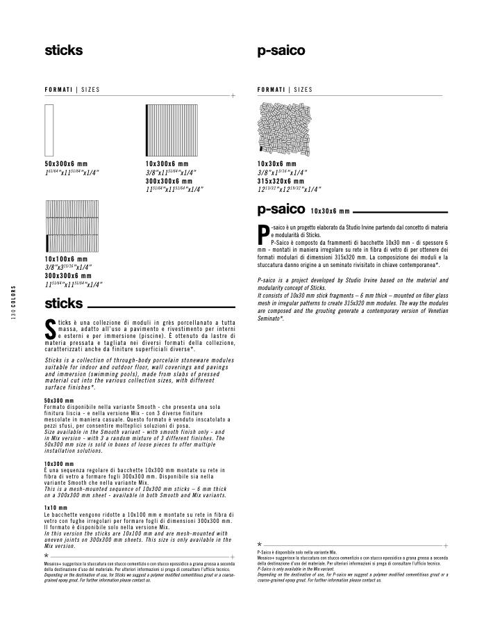 Depending on the destination of use, for Sticks we suggest a polymer modified cementitious grout or a coarse-