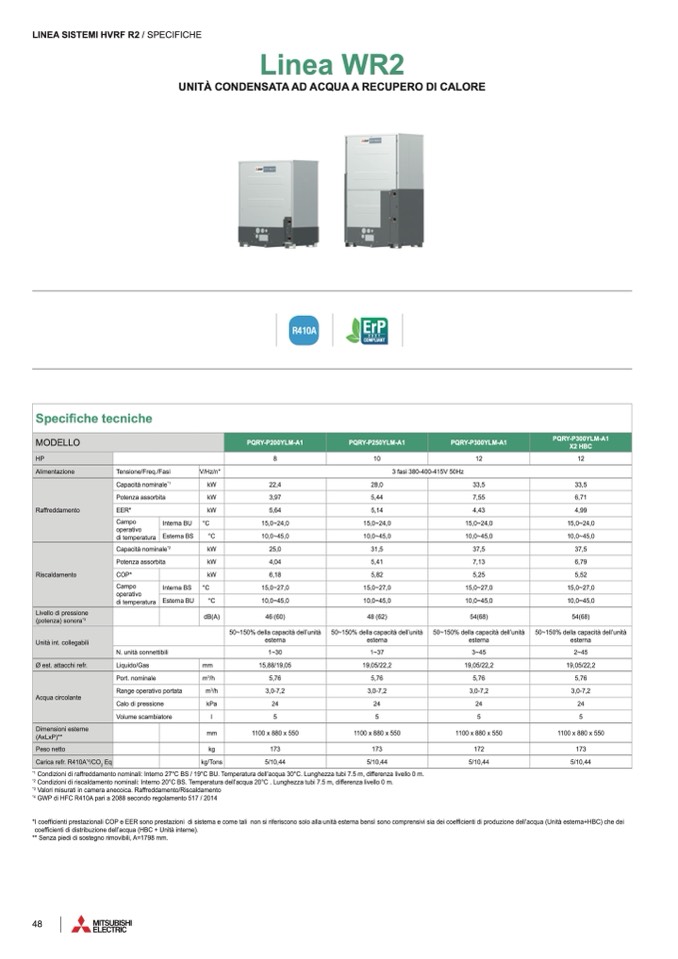 Condizioni di raffreddamento nominali: Interno 27°C BS / 19°C BU. Temperatura dell’acqua 30°C. Lunghezza tubi 7.5 m, differenza livello 0 m.