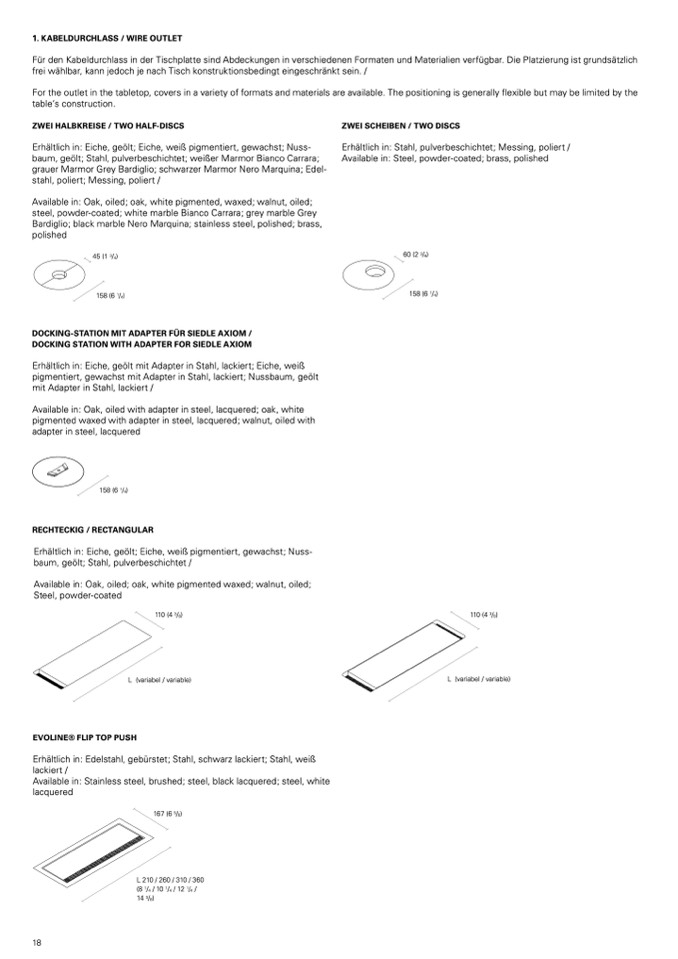 für den kabeldurchlass in der tischplatte sind abdeckungen in verschiedenen formaten und materialien verfügbar. Die Platzierung ist grundsätzlich