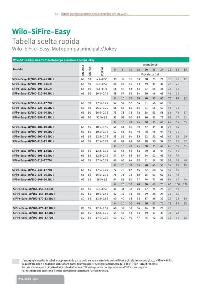 L’area grigia inserita in tabella rappresenta la parte della curva caratteristica oltre il limite di selezione consigliato, NPSHr = 6.5m.