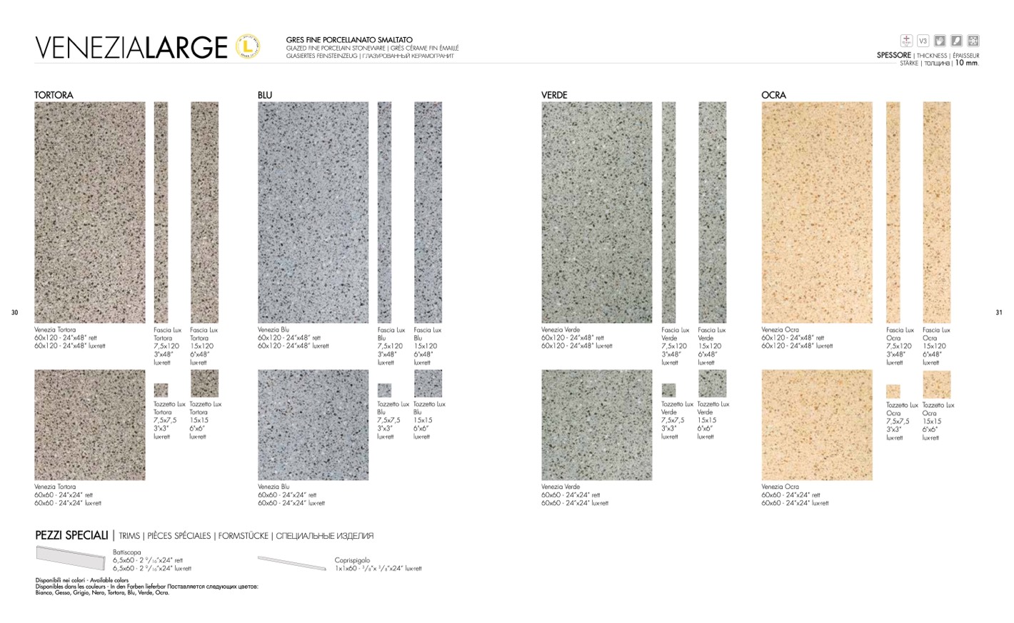 Bianco, Gesso, Grigio, Nero, Tortora, Blu, Verde, Ocra.