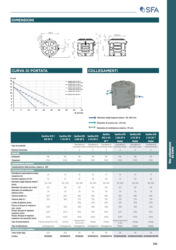 Diametro degli ingressi esterni : 50, 100 mm
