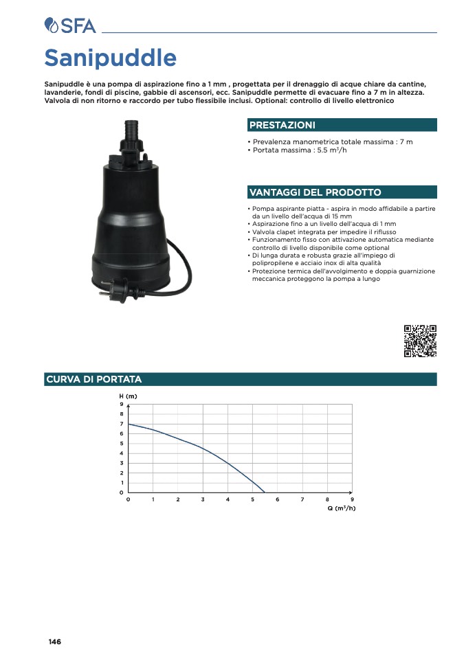 Sanipuddle è una pompa di aspirazione fino a 1 mm , progettata per il drenaggio di acque chiare da cantine,